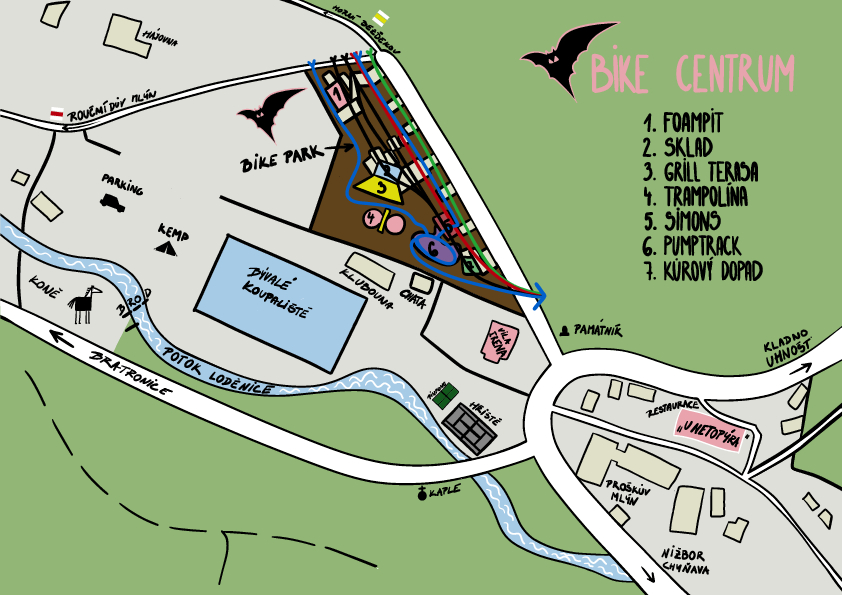 Součástí areálu je klubovna, louka, pumptrack a bike park – místo otevřené dětem, dospělým, začátečníkům i zkušeným jezdcům. Areál zároveň slouží jako základna pro komunitní akce a Netopýr Bike Fest, ale žije i během běžných dní, kdy se tu scházejí místní jezdci nebo rodiny.